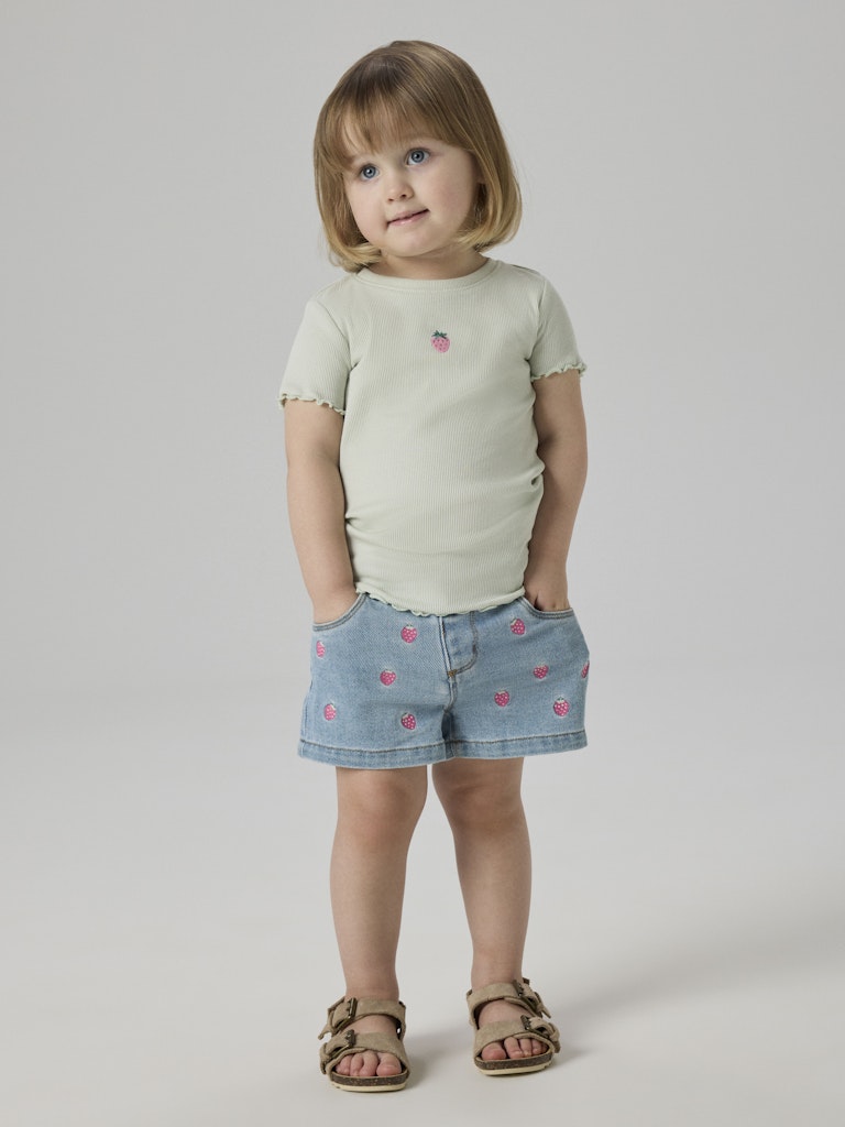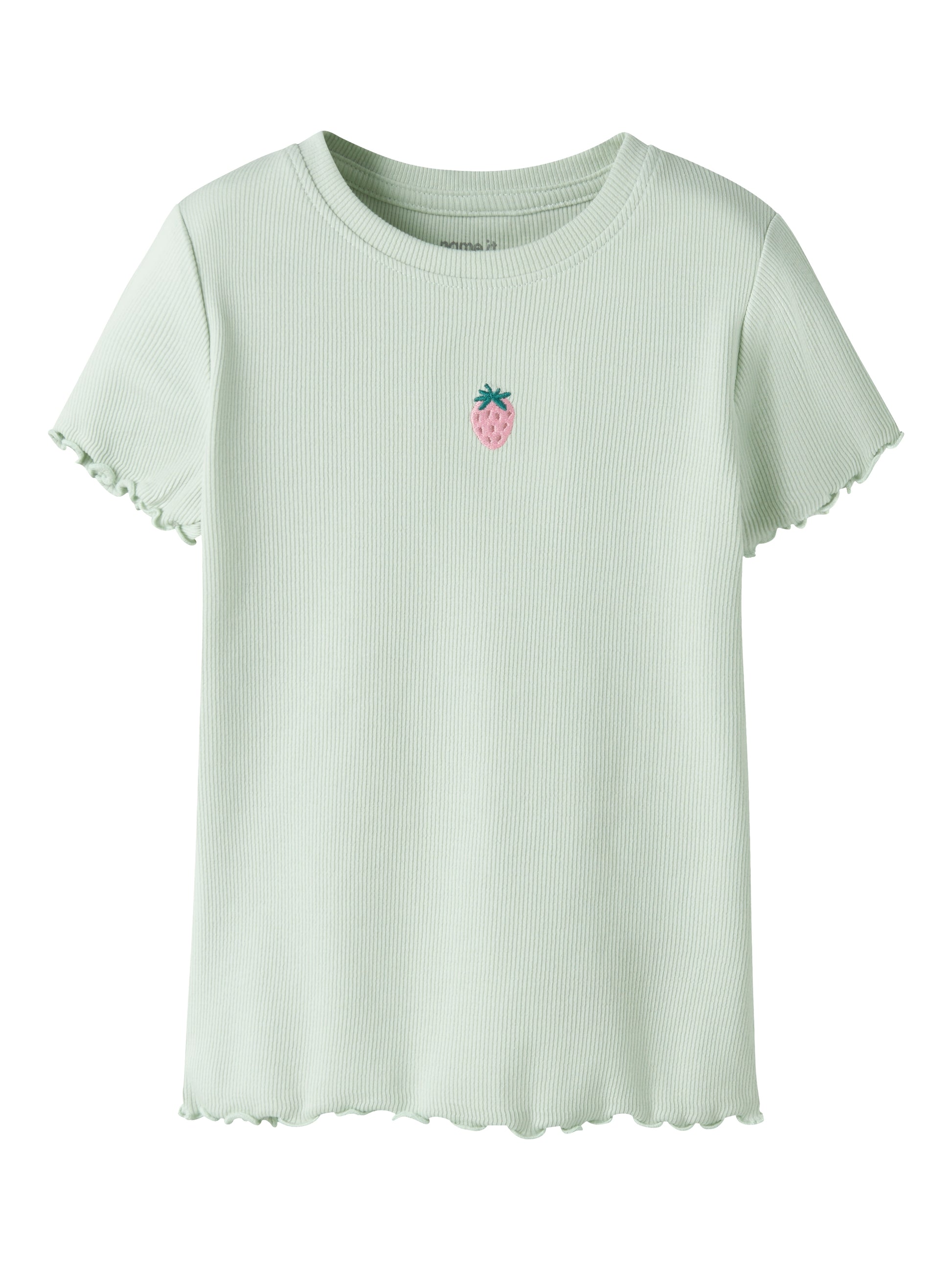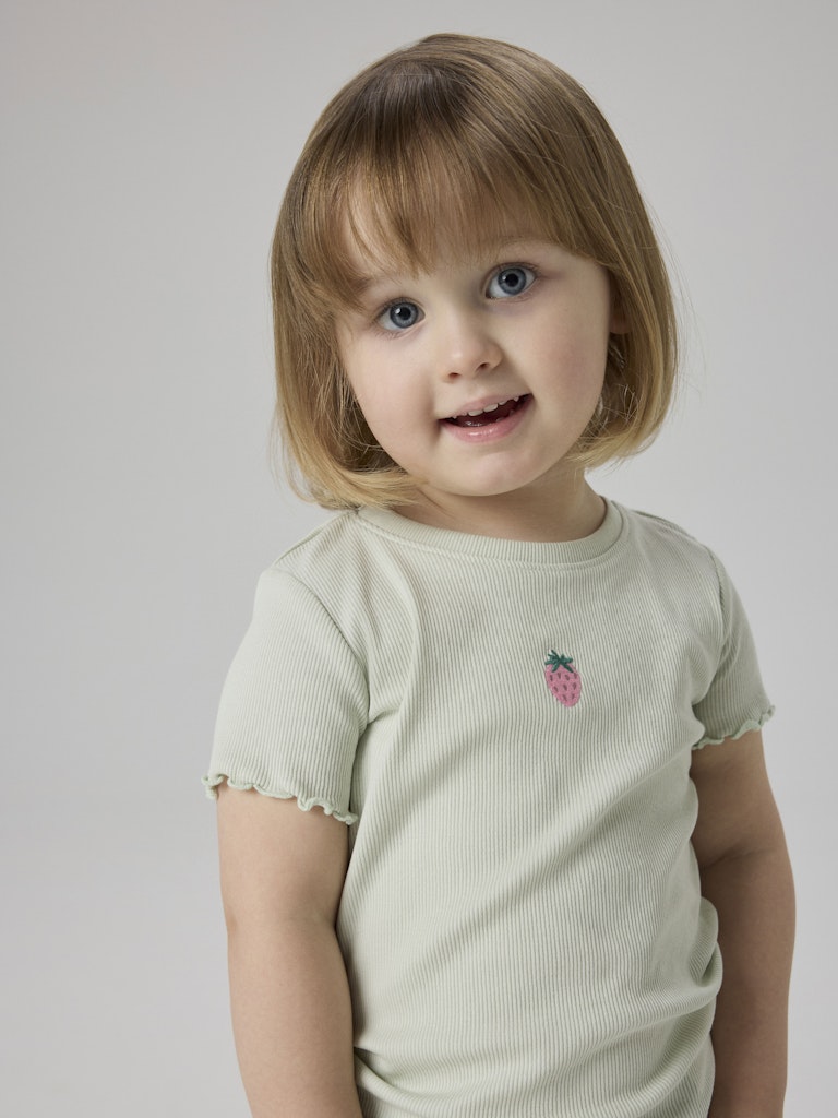 Denne søte t-skjorten i pastellgrønn med ett lite, brodert jordbær er en favoritt i sommergarderoben. Den har en normal lengde og en smal, behagelig passform som sitter fint uten å være trang, og den lette, myke jerseykvaliteten gjør den perfekt for både lek og hverdagsbruk.