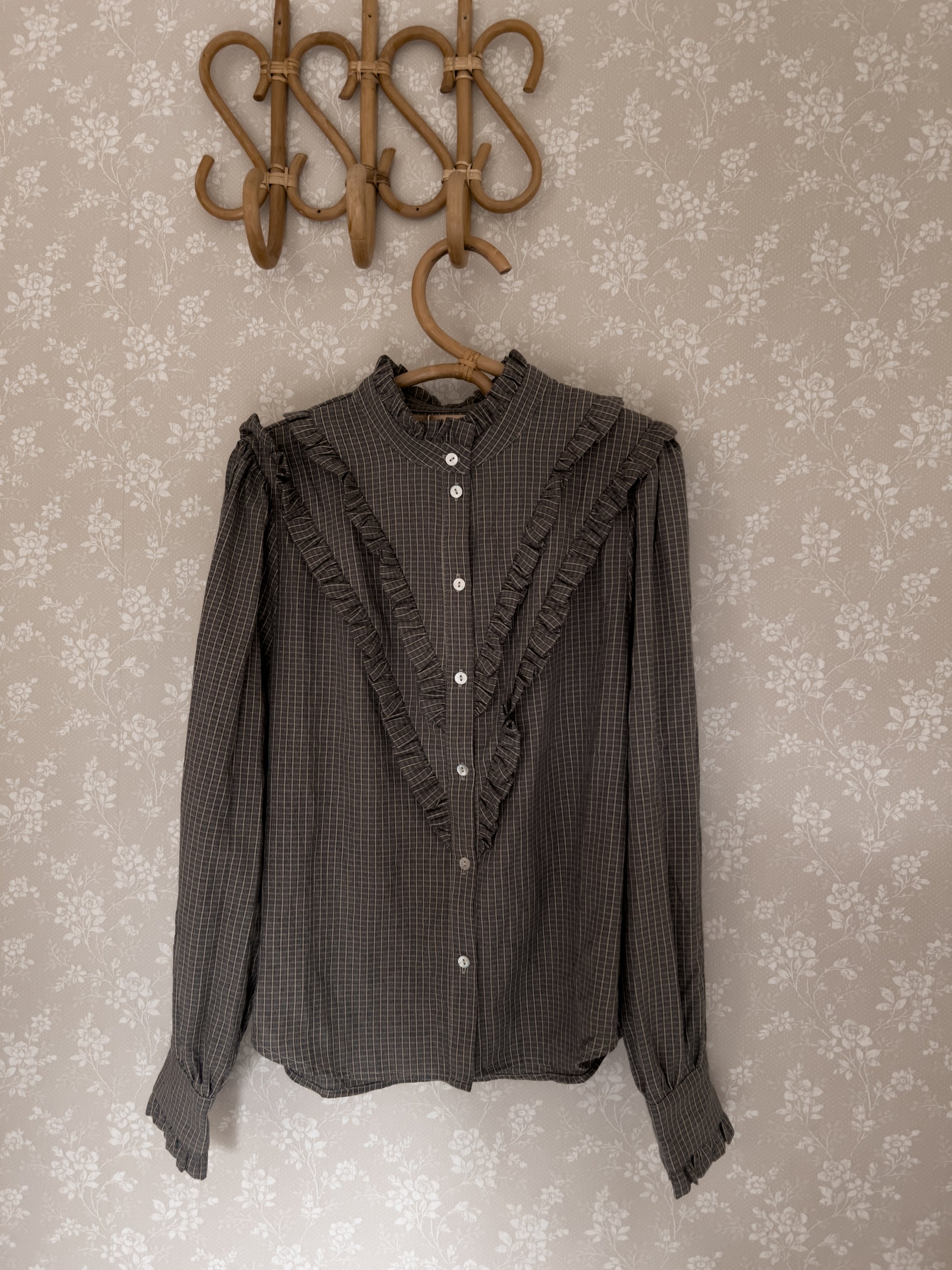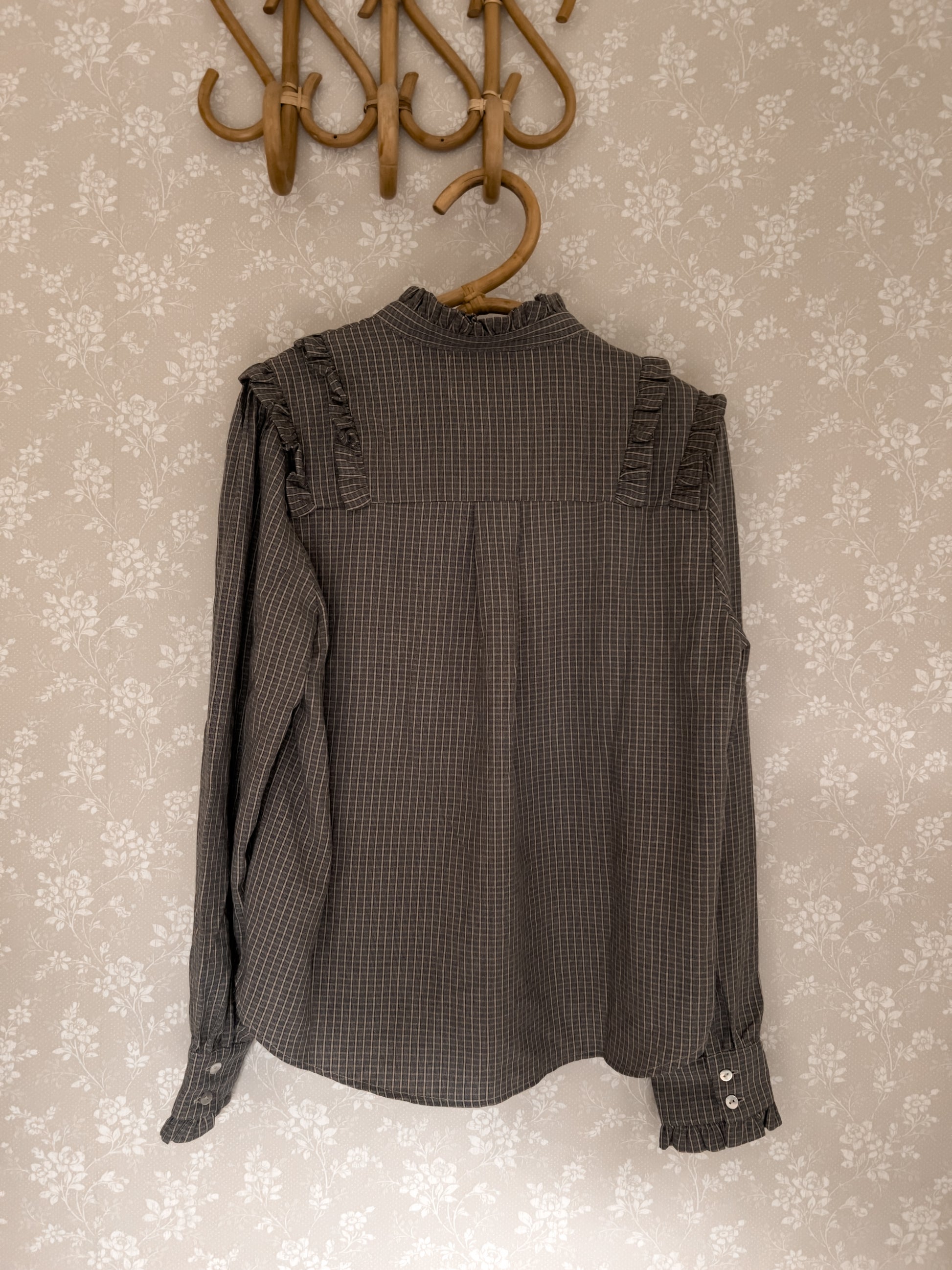 En feminin skjorte med lekre detaljer og en romslig passform. Skjorten har et diskret rutemønster i sort og krem, og er pyntet med et dekorativt volangbånd som danner en V-form nedover front og skuldre. Brede mansjetter og myke folder ved bærestykket gir ekstra sjarm, og gjør skjorten enkel å style både til hverdags og mer pyntede anledninger. Bruk den gjerne med matchende bukser for et komplett sett, eller alene sammen med jeans og boots.