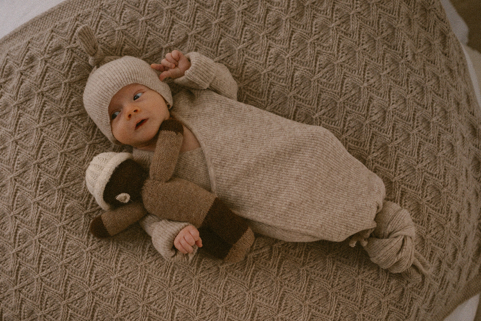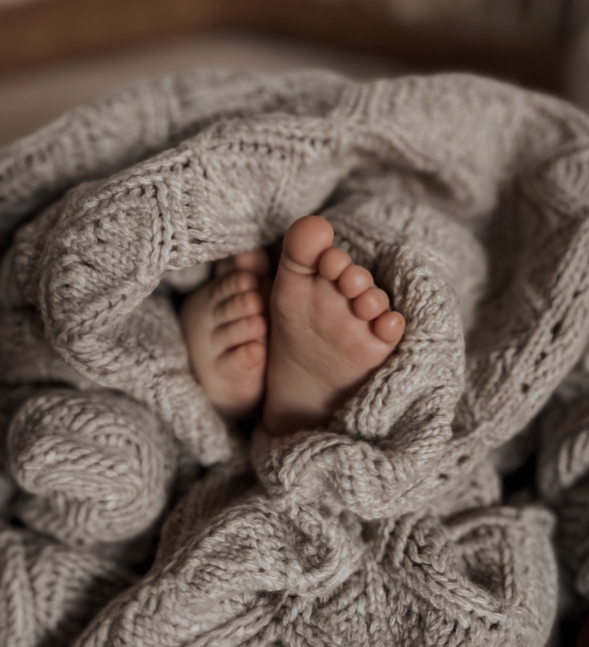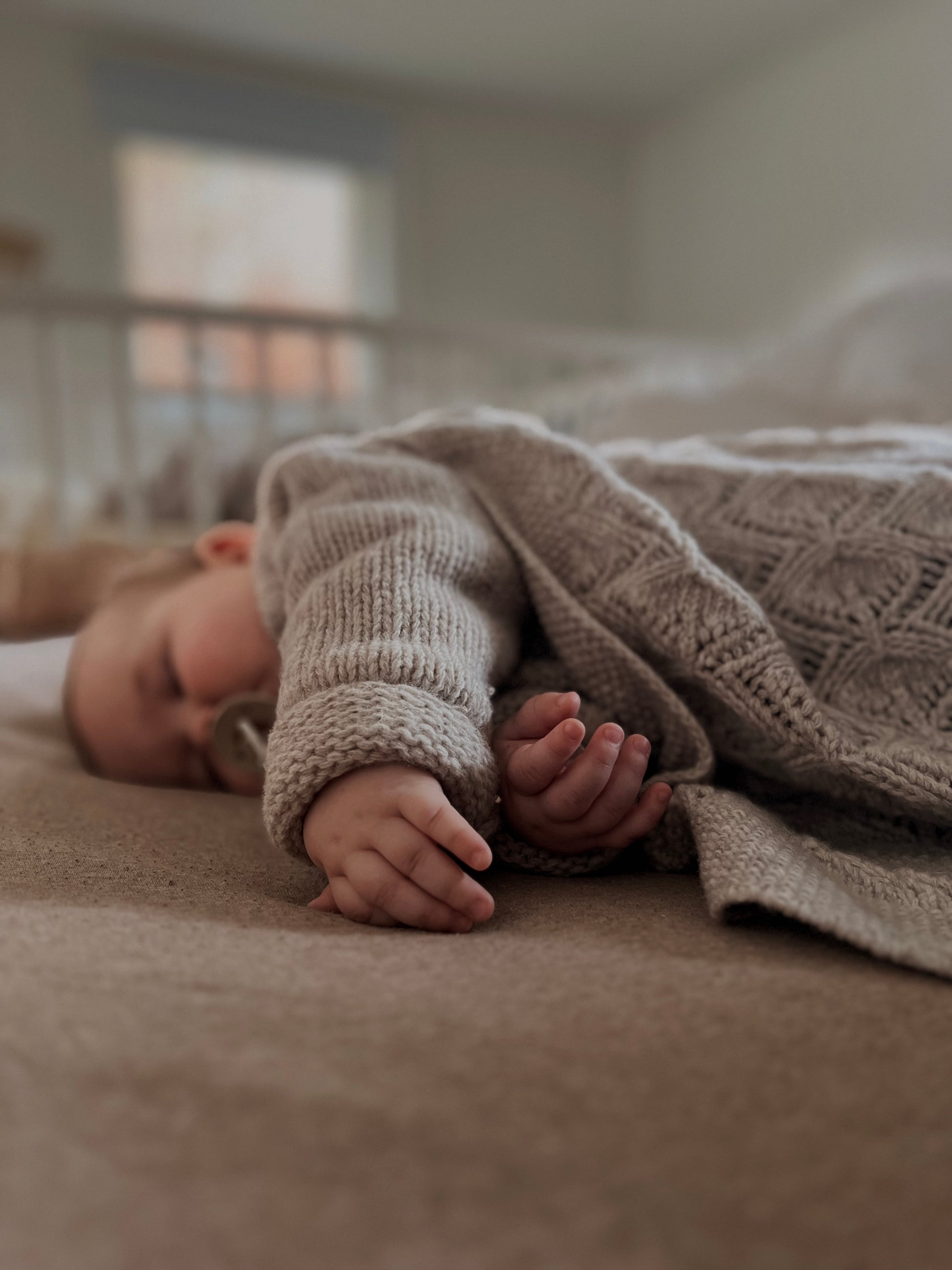 Et trygghetsteppe som følger babyen gjennom hele babytiden, fra kosestunder og trilleturer til rolige sovestunder. Den fine strikkestrukturen og den deilige ullen gjør teppet både vakkert og behagelig.